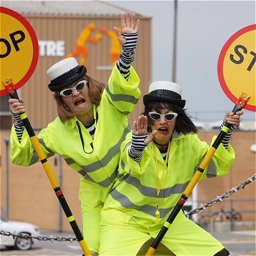 With excessive enthusiasm and a slippery grip on reality, the Lollipop Patrol are here to demonstrate and share its skills. Helping and hindering, fluorescent and effervescent, the 64th emergency service, the luminous hand of the law, they are a veritable flurry of fluoro. Experience their traffic-trauma, delight in their neon neurosis, and cross them at your peril!